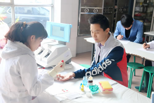 市血液中心工作人員正在給獻(xiàn)血人員進(jìn)行血液檢測(cè)